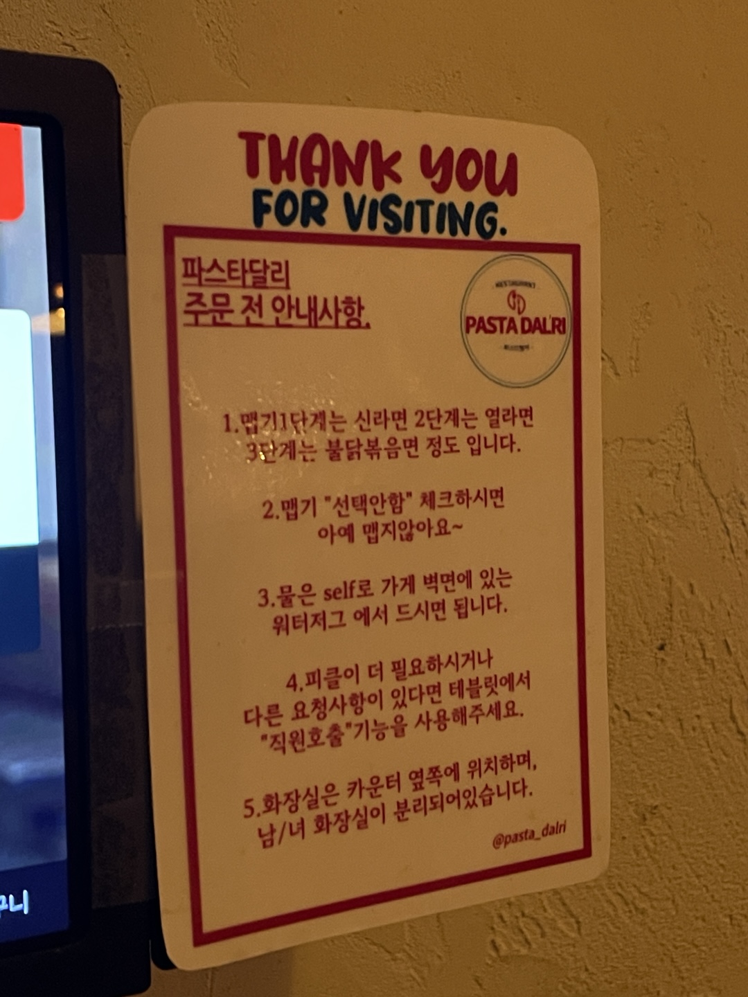 파스타 달리는 파스타의 매운맛 정도을 선택할 수 있었어요!
