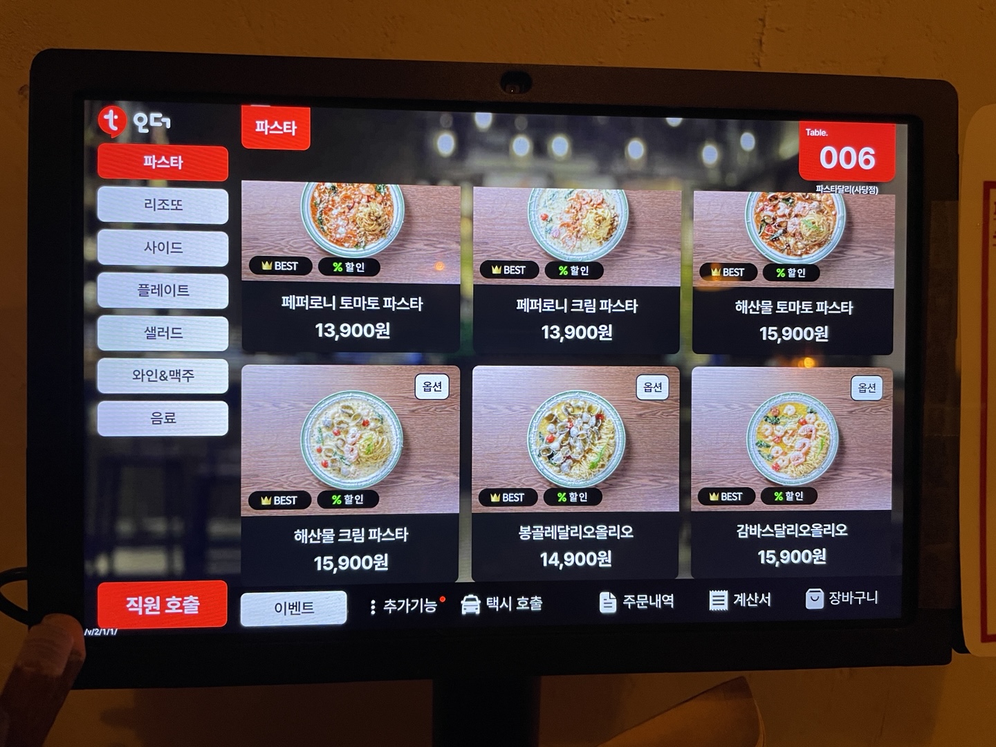 저희는 해산물 크림 파스타, 해산물 토마토 마스타, 버팔로윙봉 4pcs를 주문했어요.