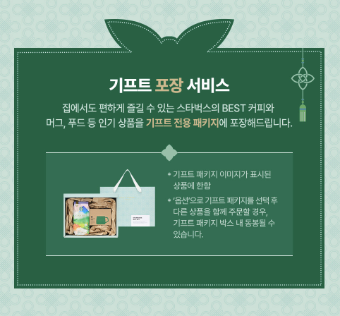 ์Šคํƒ€๋ฒ…์Šค์˜ ๋ฒ ์ŠคํŠธ ์ปคํ”ผ์™€ ๋จธ๊ทธ, ํ‘ธ๋“œ ๋“ฑ ์ธ๊ธฐ ์ƒํ’ˆ์„ ๊ธฐํ”„ํŠธ ์ „์šฉ ํŒจํ‚ค์ง€์— ํฌ์žฅํ•ด๋“œ๋ฆฝ๋‹ˆ๋‹ค.
