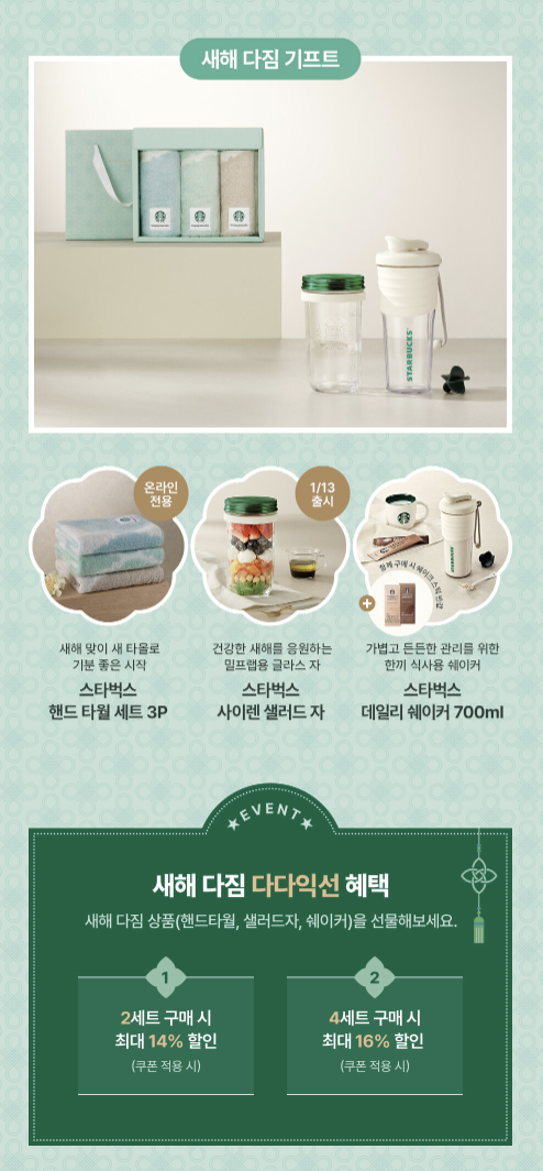 • ์Šคํƒ€๋ฒ…์Šค ํ•ธ๋“œ ํƒ€์›” ์„ธํŠธ(3P): ์ „ํ†ต ๋ฌธ์–‘์ด ๋‹ด๊ธด ํ•ธ๋“œ ํƒ€์›” ์„ธํŠธ์—์š”.