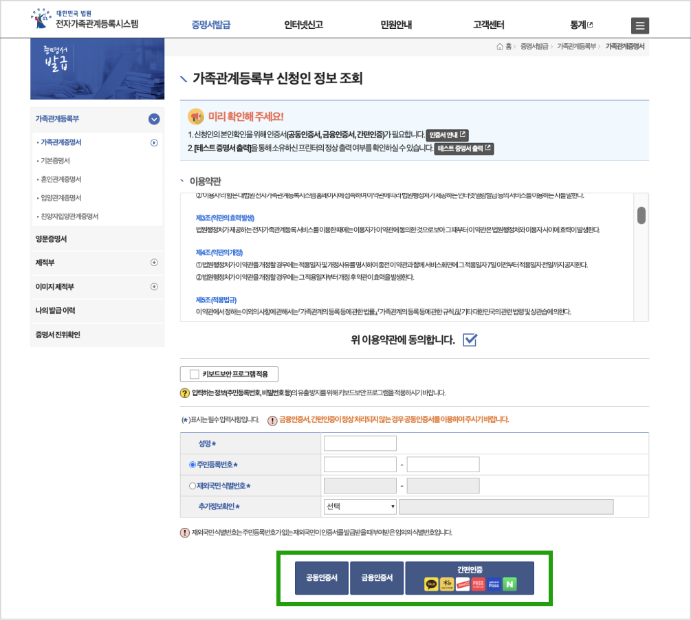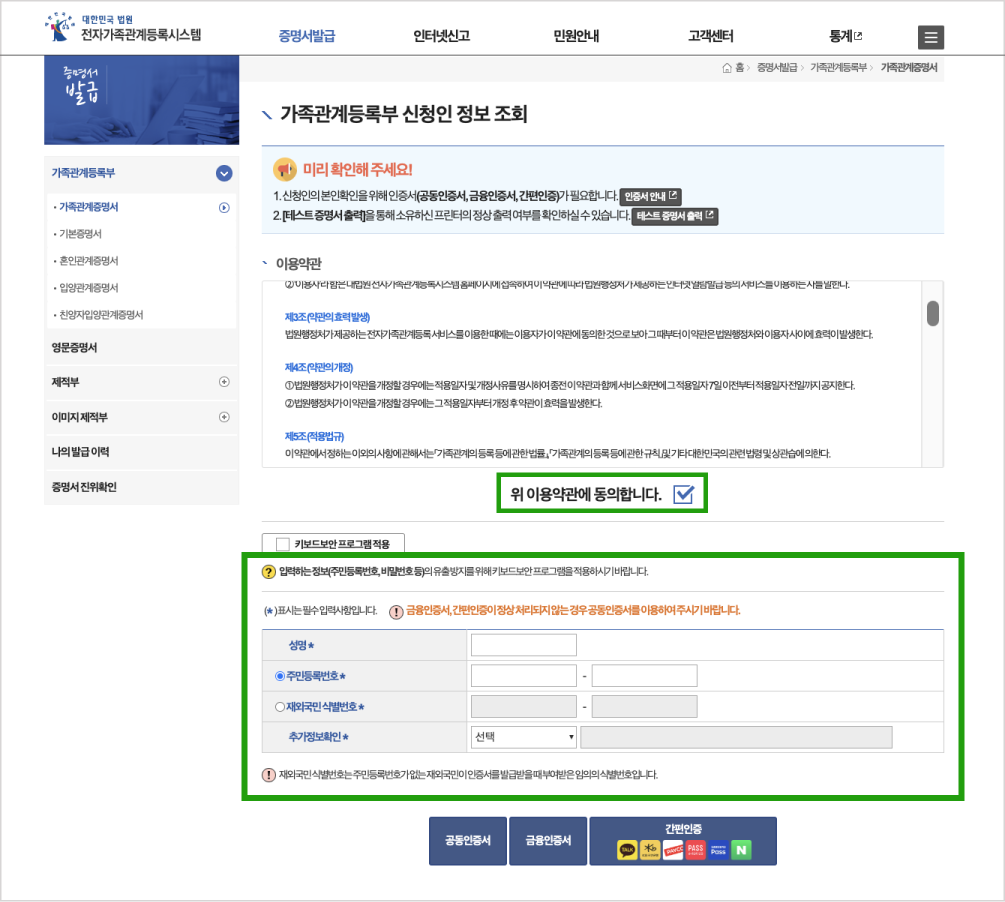 2. ๊ฐ์กฑ๊ด๊ณ์ฆ๋ช ์ > ๊ฐ์กฑ๊ด๊ณ๋ฑ๋ก๋ถ ์ ์ฒญ์ธ ์ ๋ณด ์กฐํ ํ๋ฉด์์ ์ด์ฉ์ฝ๊ด ๋์ ์ฒดํฌํ๊ณ , ์ฑ๋ช /์ฃผ๋ฏผ๋ฑ๋ก๋ฒํธ/์ถ๊ฐ์ ๋ณดํ์ธ ํญ๋ชฉ์ ๋ชจ๋ ์ ๋ ฅํฉ๋๋ค. (* ํ์๋ ํ์์ ๋๋ค.)