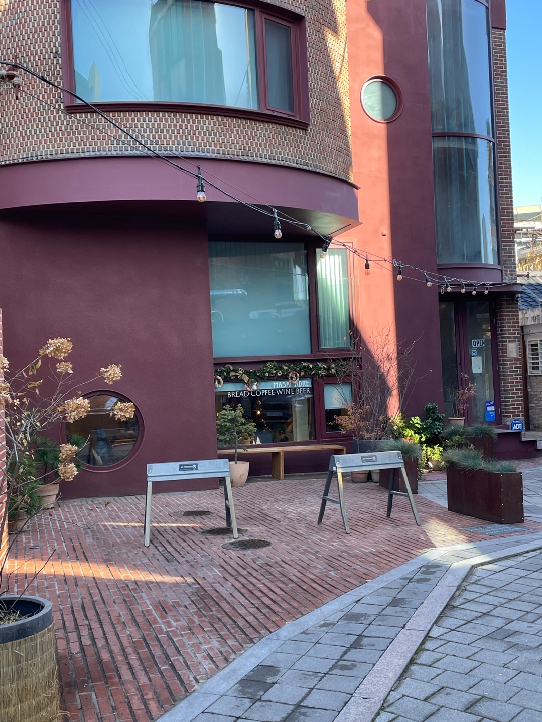 붉은색 건물 지하로 내려가면 고소한 빵 냄새로 가득찬 아늑하고 따듯한 공간이 나와요.