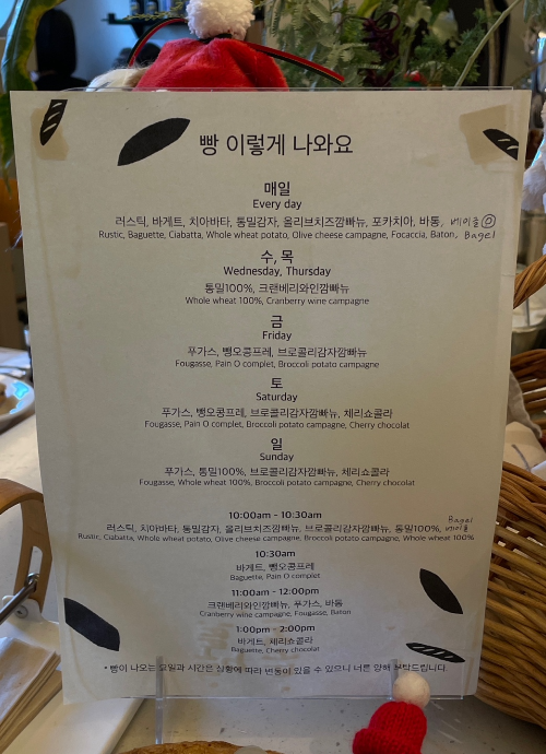 - 토요일: 푸가스, 뺑오콩프레, 브로콜리감자깜빠뉴, 체리쇼콜라