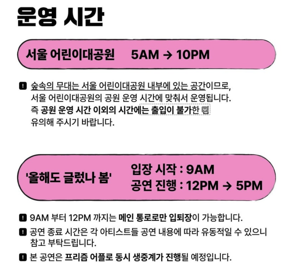 - ์ ์ฅ ์์: 9:00 (์์ธ ์ด๋ฆฐ์ด๋๊ณต์ ์ด์์๊ฐ: 5:00 ~ 22:00)