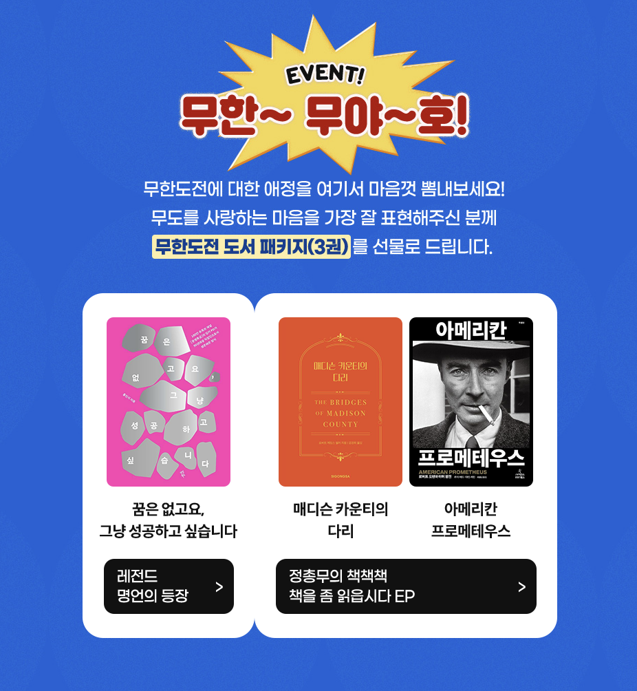 ์ด๋ฒคํŠธ ๋‹น์ฒจ์ž๋Š” ๋ฌดํ•œ๋„์ „ ๋„์„œ ํŒจํ‚ค์ง€(3๊ถŒ)์„ ๋ฐ›์„ ์ˆ˜ ์žˆ์Šต๋‹ˆ๋‹ค.