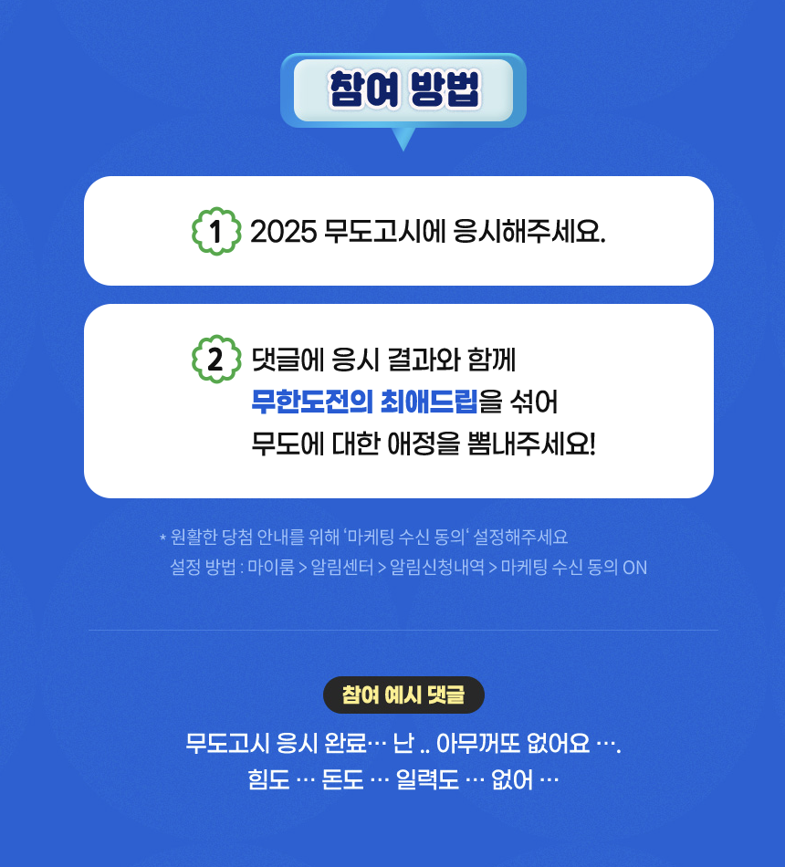 2. ๋Œ“๊ธ€์— ์‘์‹œ ๊ฒฐ๊ณผ์™€ ํ•จ๊ป˜ ๋ฌดํ•œ๋„์ „์˜ ์ตœ์• ๋“œ๋ฆฝ์„ ์„ž์–ด ๋ฌด๋„์— ๋Œ€ํ•œ ์• ์ •์„ ๋ฝ๋‚ด์ฃผ์„ธ์š”.