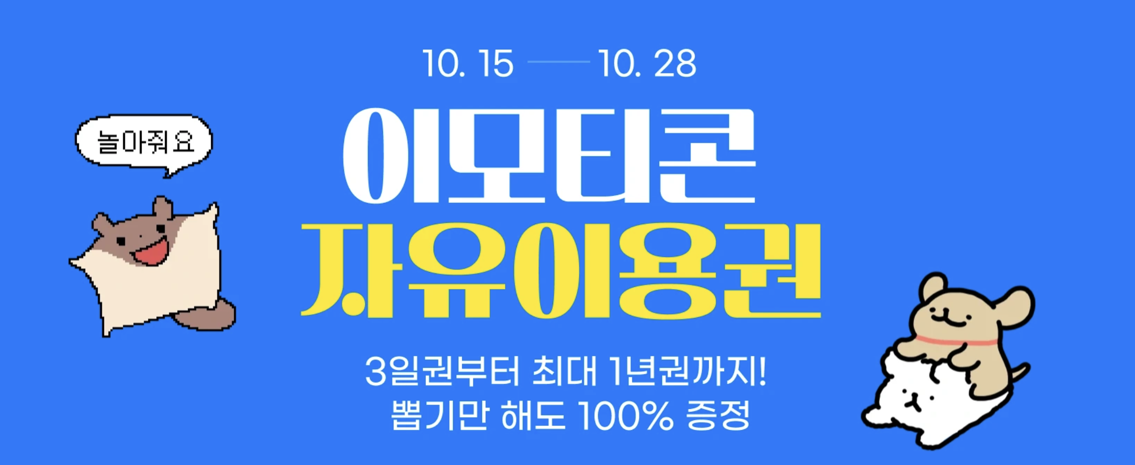 뽑기만 해도 100% 증정! 3일권부터 최대 1년권까지, 누구나 무료로 드려요. #이모티콘 #카카오이모티콘 #이모티콘자유이용권 #emoticon https://e.kakao.com/freepass_event
