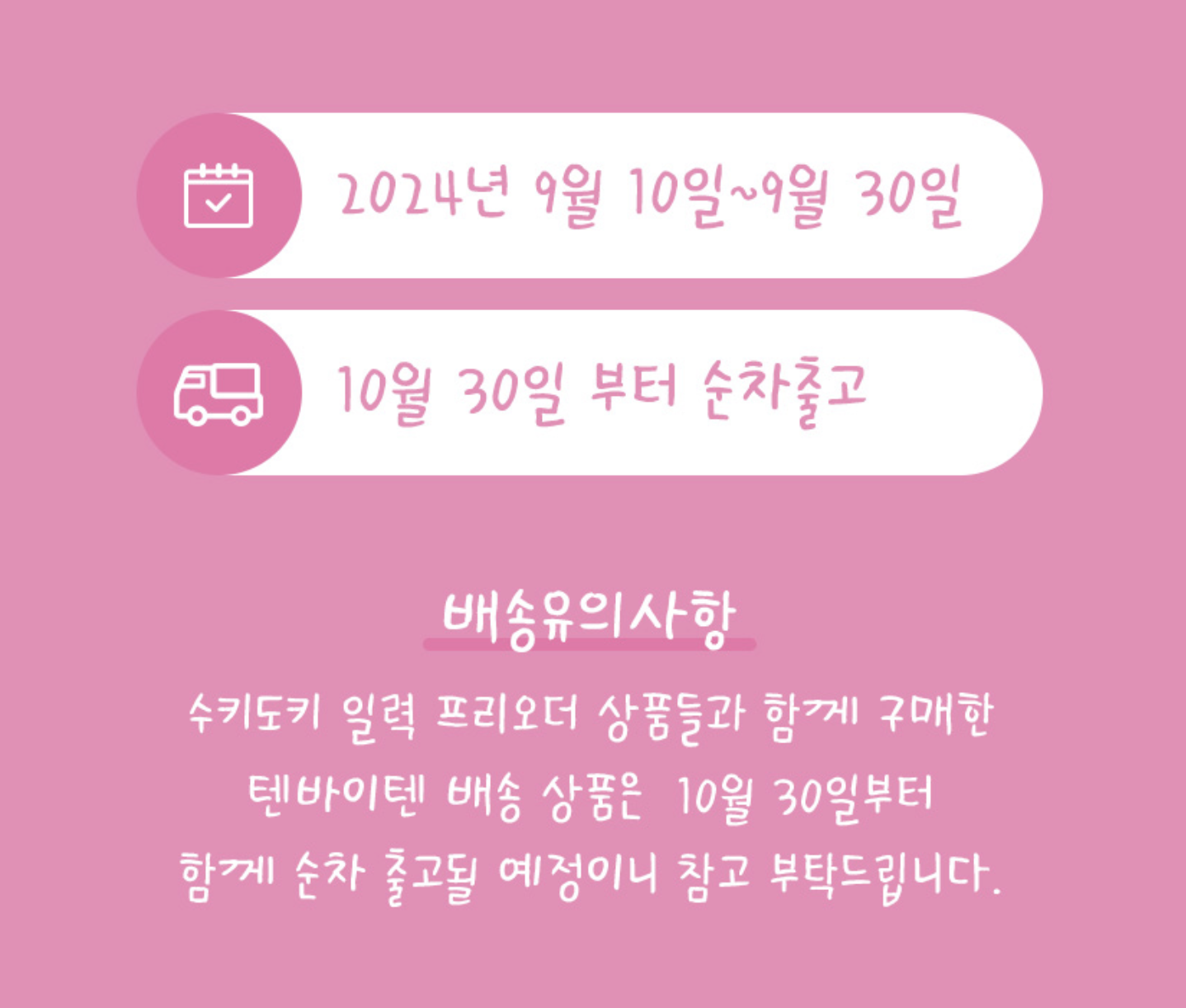 ์ํค๋ํค ์ผ๋ ฅ ํ๋ฆฌ์ค๋ ์ํ๋ค๊ณผ ํจ๊ผ ๊ตฌ๋งคํ ํ ๋ฐ์ดํ ๋ฐฐ์ก ์ํ์ 10์ 30์ผ๋ถํฐ ํจ๊ป ์์ฐจ ์ถ๊ณ ๋๋ค๊ณ ํฉ๋๋ค!